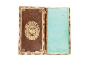[LIBERTINAGE] [LA MOTHE LE VAYER, F. De] Hexameron rustique ou les six journées passées à la Campagne entre personnes studieuses. Cologne, Pierre Brenussen, (Hollande), 1671. 1 vol. in-12. Plein veau XVIIIe, roulette d'encadrement dorée sur les plats, dos à nerfs orné, pièce de titre de maroquin vert, doublures de veau, armes dorées frappées sur les contreplats, encadrement doré avec chiffre frappé dans les angles, gardes de papier vert, tranches dorées. [2]ff, 156pp.