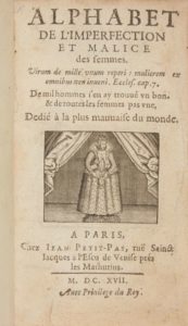 [OLIVIER, Jacques]. Alphabet de l'Imperfection et malice des femmes. De mil hommes j'en ay trouvé …