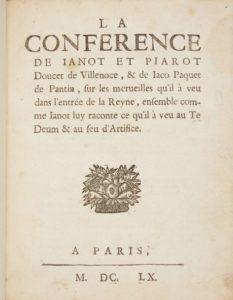 [PATOIS PARISIEN]. La conférence de Janot et Piarot Doucet de Villenoce et de Iaco Paquet de Pantin, sur les merveilles qu'il à veu dans l'entrée de la Reyne, ensemble comme Janot lui raconte ce qu'il a vu au Te Deum et au feu d'artifice. Paris, 1660. Demi-veau bleu XIXe, titre doré au dos. 12pp.