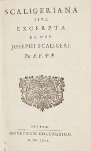 SCALIGER, Joseph. Scaligeriana sive excerpta. Genevæ, Petrum Columesium, 1666. 1 vol. petit in-8. Plein veau d'époque, dos à nerfs orné, titre doré. [2]ff, 368pp.