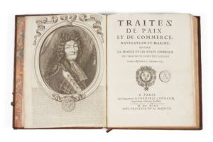 [TRAITÉS DE PAIX]. Recueil réunissant 7 traités de paix entre la France et divers pays. Paris, Frederic Leonard, 1697. 1 vol. in-4. Veau d'époque, dos à nerfs orné, pièce de titre de maroquin rouge, étiquette au caisson supérieur.
