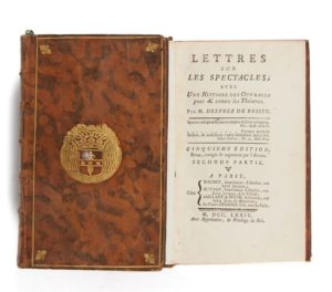 DESPREZ DE BOISSY. Lettres sur les spectacles. Paris, Boudet, Butard, Saillant & Nyon, la Veuve Desaint, 1774. 2 vol. in-12, en pagination continue. Plein veau d'époque, armes dorées au centre des plats, filet doré en encadrement avec fleur de lys dans les angles, dos à nerfs orné, pièce de titre de maroquin rouge, tomaison dorées.
