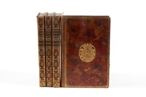 HALLER, Albrecht von. Poésies traduites de l'allemand. Nouvelle édition retouchée et augmentée/Traductions qui peuvent servir de suite aux poésies de M. Haller. Seconde partie. Berne, Aux dépens de la société, Abr. Wagner fils, 1760. 2 vol. in-12. Veau porphyre fauve d'époque, armes dorées au centre des plats, triple filet d'encadrement, dos lisse à faux-nerfs orné, pièces de titre et de tomaison en maroquin havane. 207 pp ; 196 pp.