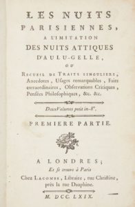 [CHOMEL]. Les Nuits parisiennes, à l'imitation des nuits attiques d'Aulu-Gelle [...]. Londres et Paris, Lacombe, 1769. 2 tomes en 1 vol. in-8. Reliure de parchemin de réemploi avec écriture manuscrite.  4 [ff], 368 pp ; 2 [ff], 344 pp.
