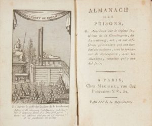[COITTANT]. Almanach des prisons, ou anecdotes sur le régime intérieur de la Conciergerie, du Luxembourg, etc., et sur différents prisonniers [...]. Paris, Michel, An III. Suivi de : Tableau des prisons de Paris sous le règne de Robespierre. Paris chez Michel, (an III). Suivi de : Second tableau des prisons de Paris, sous le règne de Robespierre. Paris (An III). 1 vol. in-12. Percaline rouge, pièce de titre de maroquin noir.