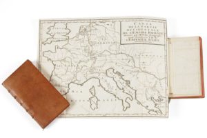 Ouvrage contenant un frontispice par J. Chereau et deux cartes dépliantes représentant les parties orientales et occidentales de l'Empire Romain dressées par I. B. Nolin Géographe >Ex-libris manuscrit de François Batard avec son cachet rouge au dos de la page de titre.