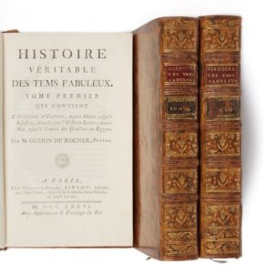GUÉRIN DU ROCHER, Pierre. Histoire véritable des tems fabuleux. Paris, Charles-Pierre Berton, 1776-1777. 3 vol. in-8. Plein veau marbré, dos à nerfs orné, pièces de titre de maroquin rouge et de tomaison de maroquin noir.