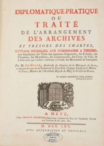 LE MOINE, Pierre-Camille. Diplomatique-pratique ou traité de l'arrangement des archives et trésors des chartes, ouvrage nécessaire aux commissaires à terriers. Metz, Chez Joseph Antoine, 1765. 1 vol. in-4. Plein veau d'époque, dos à nerfs orné, pièce de titre de maroquin rouge.