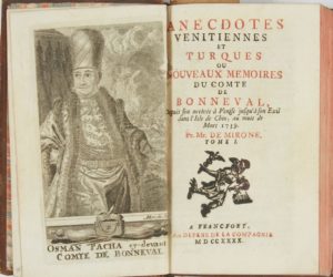 MIRONE, M. de - [SAUMERY, Pierre Lambert de]. Anecdotes vénitiennes et turques, ou Nouveaux mémoires du Comte de Bonneval, depuis son arrivée à Venise jusqu'à son exil dans l'Isle de Chio, au mois de mars 1739. Francfort, aux depens de la Compagnie, 1740. 2 tomes en 1 vol. in-12. Plein veau d'époque, dos à faux nerfs orné, titre doré.