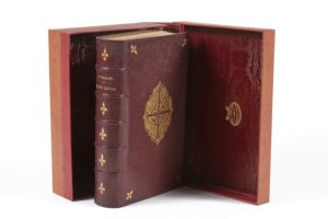 WALLON, H. Saint-Louis. Tours, Alfred Mame et Fils, 1878. 1 vol. in-4. Plein maroquin aubergine, large médaillon central doré orné d'une croix stylisée, fleurs de lys en angle, dos à nerfs, fleur de lys dans les caissons, titre et auteur dorés, tranches dorées, dentelle intérieure, gardes de papier doré à motifs, dans une boite d'ornement cartonnée, portant le monogramme G. C. couronné. [E. & A. LESORT].