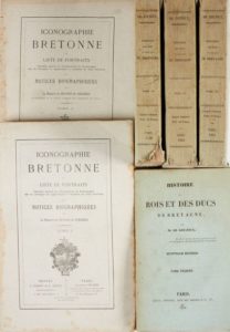 GRANGES DE SURGÈRES Marquis de. Iconographie bretonne ou liste de portraits dessinés, gravés ou lithographiés de personnages nés en Bretagne [...]. Avec Notices biographiques. Rennes, Paris, J. Plihon et L. Hervé, Paris, Alphonse Picard, 1888 - 1889. 2 vol. in-4. Brochés, couvertures imprimées, exemplaire non coupé.