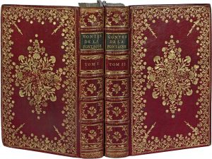 La plus belle et la plus réussie des imitations de l'édition des fermiers généraux. Conçue à l'identique de son célèbre modèle paru deux ans plus tôt, l'illustration de cette édition comprend un portrait-frontispice (avant la signature), 2 fleurons sur les titres, 2 vignettes tirées hors texte, 2 en-têtes, 61 culs-de-lampe non signés (dont 9 nouveaux et 52 copiés de Choffard) et 80 figures hors texte d'après celles d'Eisen, gravées par Charles Boily, l'élève de Lempereur. Agréable exemplaire dans une jolie reliure hollandaise en maroquin orné de gerbes de fleurs dorées. Infimes craquelures sur les dos, taches sans gravité aux pp. 133-140 du premier tome. On y joint un portrait in-8 de La Fontaine gravé par Bertonnier vers 1832, volant, dans sa chemise de livraison d'origine. Rochambeau, 526, n°81 – Hédé-Haüy, 50-52 – Cohen, 569.