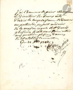 « J’ai l’honneur de prier Monsieur le Directeur des beaux arts d’avoir la complaisance de donner au porteur du présent médecin de la Maison royale de St Denis plusieurs billets pour faire entrer aux Invalides plusieurs dames de cet etablissement »…