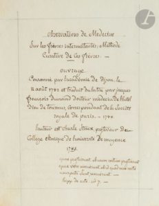 médecine. Jacques-François DUNAND (1748-1823) médecin, maire de Tournus. Manuscrit autographe signé, Observations de Médecine sur les fièvres intermittentes ; méthode curative de ces fièvres…, 1788 ; 375 pages petit in-4, reliure demi-basane fauve avec pièce de titre veau rouge au dos (plats un peu épidermés).