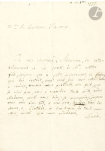 Marie-Thérèse de Savoie, comtesse d’ARTOIS (1756-1805) fille du Roi de Sardaigne Victor-Amédée III, épouse (1773) du comte d’Artois, le futur Charles X. L.A.S. « Marie », 12 octobre 1777, [à la marquise d’Usson] ; 1 page petit in-4.
