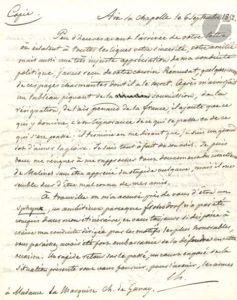 Aix-la-Chapelle 6 septembre 1852, à la marquise Charles de Ganay. Il résume le « tableau piquant de la soumission, de la résignation » de la France, selon Rémusat, cousin de la marquise, et se plaint que celle-ci l’ait mal défendu « d’être un sphynx, un ambitieux parce que Frohsdorf n’a pas été compris dans mon itinéraire »… Il rappelle ses positions depuis 1848 : « sobre de paroles » en tant que commandant de la division de Paris et la Garde nationale, « le Christ » à l’Assemblée législative dont la plupart de ses membres l’ont abandonné et trahi, et qui n’a pas écouté ses conseils… Il cite parmi ses opposants Berryer, Salvandy, Falloux, blâme « la funeste campagne de la révision » de la Constitution et des fautes qui ont perdu l’Assemblée et l’ont conduit en exil. Depuis, il a été sollicité par le duc d’Aumale, la duchesse d’Orléans et le comte de Chambord, et il a dit aux deux partis : « En présence d’un ignoble et insolent despotisme les républicains, s’il y en a d’assez bonne foi pour reconnaître que leur utopie est odieux à la France, et les Royalistes de toutes les nuances devaient se rallier pour montrer à notre pays l’espérance d’un gouvernement régulier, libre, et fort que la monarchie représentée par le Cte de Chambord entouré et secondé par ses cousins peut seule lui donner »… Face à « L.B. », les deux branches devraient déjà être réconciliées… Il souligne l’importance d’un accord formel et retrace les tractations difficiles et les erreurs de Chambord… Malines 4 janvier 1853, au comte Paul de Périgord. « Je n’ai refusé mes conseils ni à Froshdorf, ni à Claremont mais on se lasse de tout, même de parler à des sourds »… Cependant il estime que le comte de Chambord lui-même méconnaît le caractère inaliénable de la légitimité, et que même ceux qui ont fait la révolution de 1830 devraient tâcher de gagner des partisans sans leur faire subir un interrogatoire sur leur catéchisme politique… Que le comte de Chambord ait refusé d’ouvrir sa porte aux Orléanistes « avant qu’ils eussent récité leur confiteor » est une faute lamentable... Il justifie le titre de Reine de Marie-Amélie… Bruxelles 24 octobre 1858, à Philippe-Bernard de Laguiche. Texte d’une réponse à faire à ses critiques : « En refusant de faire, à la France moderne, la concession du drapeau qu’elle préfère parce qu’il n’est pas celui de l’ancien régime ; en se montrant offensé quand on donne, à sa tante, le titre de Reine, Mr le comte de Chambord a licencié les hommes qui ont souhaité la réconciliation, la coalition des royalistes de toutes les nuances, sans en excepter les républicains désabusés. Il demeure exclusivement le chef du pur légitimisme, et le général Changarnier ne veut pas faire acte d’adhésion à ce parti. […] Les princes de la maison d’Orléans ont été ses compagnons de guerre ; connaissant très bien l’indépendance de ses opinions, ils sont bienveillants pour lui ; il les aime. Pourquoi donc se refuserait-il la satisfaction de les voir ? »…
