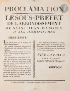 CHARENTE-INFÉRIEURE. 17 affiches, 1793-1830, impr. de Saintes, Saint-Jean d’Angély ou La Rochelle ; quelques vignettes (défauts à quelques pièces).