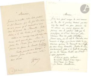 Gustave FLOURENS (1838-1871) révolutionnaire, membre de la Commune, colonel, tué lors d’un combat contre les Versaillais. 2 L.A.S., 1859 et s.d., à Jules Janin ; 1 page et demie et 1 page in-8 (cachets de la coll. Louis Bretonnière).