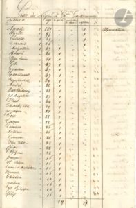 « Journal des travaux et comptes de dépenses fabrication de sucre et rhum, envois au bourg de l’habitation La Mineure pour l’année 1828 » (du 1er avril au 30 juin 1828 ; 46 pages). À la fin, sur 5 pages, « Liste des Nègres » de l’habitation (142 en tout) avec leurs nom, âge (de 101 à 4 ans) ; dans les observations, on note que certains sont achetés récemment.