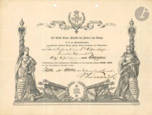 GUERRE DE 1870. Brevet, Posen 21 octobre 1871 ; 1 page oblong in-4 en partie impr. avec décor gravé d’A. Vogel (2 petits trous d’archivage) ; en allemand.