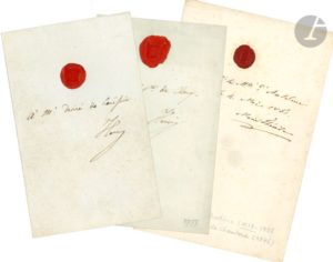 Cachets de cire rouge à sa devise Fides Spes avec envois au vicomte de Clary, et à Désiré de Couëssin. On joint une P.A.S. semblable de sa femme Marie-Thérèse à la marquise d’Anselme… – Lettres-circulaires en fac-similé relatives aux vœux populaires pour son mariage (à Charrette, 1847), à sa position vis-à-vis de la France (juin 1848), au principe de la monarchie héréditaire de droit divin (1852), à ses idées sur la décentralisation (1862).