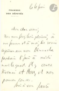 « Vous nous ferez bien plaisir, à ma femme et à moi, de venir déjeuner avec nous Dimanche prochain 8 juin à midi moins le quart. Il y aura Viviani et Herr, et nous pourrons causer »… [La lettre réunit les noms des principaux fondateurs de L’Humanité, en 1904 : Jean Jaurès, Aristide Briand, René Viviani et Lucien Herr.]