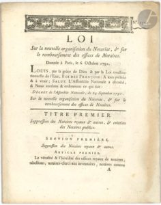 NOTARIAT. 4 pièces imprimées, 1791-1794 ; impr. de Paris et Saintes ; in-4, un bandeau …