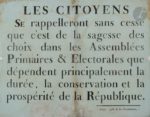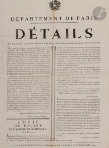 4 affichettes d’articles de la Déclaration des Droits de l’Homme et du Citoyen, du Code Constitutionnel, de la Constitution, et de la Déclaration des Droits (« Nul individu, nulle réunion partielle de citoyens ne peut s’attribuer la Souveraineté ») ; Loi qui règle le mode de promulgation des lois (5 nov. 1790) ; Loi relative au droit qu’ont les citoyens de former des sociétés libres (19 nov. 1790) ; Loi relative aux honneurs à décerner aux Grands Hommes jugés tels par le corps législatif (10 avril 1791) ; Département de Paris, Détails relatifs à l’arrestation du Roi et de la Famille royale à Varennes (juin 1791) ; Décrets de l’Assemblée Nationale du 21 juin 1791 ; Loi relative à la suspension du Pouvoir exécutif (10 août 1792) ; Décrets de la Convention Nationale ; Lois  ; Proclamations et Adresses du Conseil Exécutif ou de la Convention Nationale, au Peuple Français, etc…
