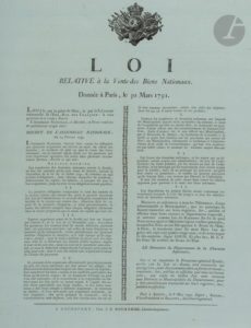 Décret de la Convention Nationale Relatif à la vente des Meubles et Immeubles provenant des Emigrés et autres effets nationaux (24 avril 1793) ; Décret de la Convention Nationale Relatif à la vente des créances de la Nation affectées sur les Biens Nationaux (5 juin 1793) ; Décrets de la Convention Nationale prescrivant l’enlèvement des signes de royauté et de féodalité (18 vendémiaire II) ; Décret de la Convention Nationale relatif à l’administration & à la vente des Biens confisqués au profit de la République ; Arrêté du Directoire Exécutif Concernant les individus condamnés à la déportation (3 frimaire VII) …