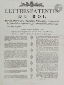 Proclamation du Roi pour la confection des rôles de supplément, sur les ci-devant Privilégiés, etc. (14 oct. 1789) ; 2 Lettres-Patentes du Roi (mars-avril 1790) sur la perception des impôts, la suppression de la Gabelle… ; Loi sur la contribution foncière ; Loi qui accorde une somme de quinze millions pour être employée à l’établissement d’Ateliers de Charité (19 déc. 1790) ;  Loi relative aux pensions (25 fév. 1791) ; Loi Relative à la suppression des chambres des Comptes & à la nouvelle forme de Comptabilité (29 sept. 1791) ; Loi qui fixe les règles de comptabilité conformément au nouveau système des poids et mesures (17 floréal VII) ; Lois relatives aux Domaines Nationaux, aux rentes foncières, à l’administration des Hospices civils, au paiement des rentes et pensions, à la perception des droits d’hypothèque, à la taxe d’entretien des routes, à l’établissement d’une taxe sur le tabac, aux contraventions en matière de grande voierie, etc…