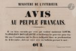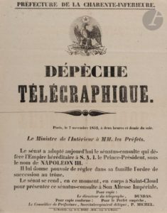 Bel ensemble sur le coup d’État du 2 décembre 1851(décembre 1851-janvier 1852). 2 déc. 1851 : Le Président de la République décrète « Art. 1 : L’Assemblée Nationale est dissoute »… ; Proclamation du Président de la République, Appel au peuple ; Proclamation du Président de la République à l’Armée ; etc. 5 dépêches télégraphiques de Paris (3-4 déc.) ; Résumé des dernières dépêches télégraphiques venues de Paris : « Paris est calme. Le gouvernement est entièrement maître de la situation. Faites arrêter les colporteurs de fausses nouvelles indiquant le contraire »… Appel au Peuple : « Le peuple français veut le maintien de l’autorité de Louis-Napoléon Bonaparte et lui délègue les pouvoirs nécessaires pour établir une Constitution »… Ministère de l’Intérieur, Avis au Peuple français « Il est bien entendu que ceux qui veulent maintenir Louis-Napoléon Bonaparte […] doivent voter avec un bulletin portant le mot : OUI » ; Sénatus-Consulte portant modification de la Constitution ; etc.