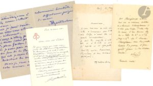 Ferdinand Bac, Auguste Bartholdi (et lettre de Tony Robert-Fleury sur les funérailles de Bartholdi), Albert Bartholomé, Paul Baudry, Eugène Bellangé, Albert Besnard, Maurice Brianchon, Alexandre Brongniart, Camille Bryen (photographie), Bernard Buffet (eau-forte), Philippe Burty, Étienne Carjat (2 à Henri de Bornier), Cham (dessin), Antoine Chapu, Joseph-Mathieu Chauvet (sur la fondation du musée de Vichy), Benjamin-Constant (photographie), Lucien Coutaud (eau-forte), Maxime Dethomas, Mgr Louis Duchesne, Georges d’Espagnat, Jules Guiffrey, Guyot de Fère, Louise Hervieu (lithographie), André Jacquemin (3 eaux-fortes dont 2 signées), Job, Édouard Kahn, Ernest Laborde (eau-forte signée), Lap (2 dessins pour le Canard Enchaîné), André Lebon (10 dessins de presse), Herbert Lespinasse (bois gravé), Lucien Lévy-Dhurmer, Eugène Martel (5 à Auguste Bréal), Daniel de Monfreid, Hélène Morin (dessin), Théodore Muret (à Mme Fantin-Latour), Oscar de Négrier (lettre à Jeanniot quittant l’armée pour se lancer dans l’art, 1881), Émilien de Nieuwerkerke, Paulin-Guérin (2), Édouard Pingret (promettant un portrait de Paganini à Joseph Zimmermann), Claudius Popelin (poème a.s. à Ernest Hébert), René Quillivic (2), Ary Renan (2, une avec dessin), A. Dunoyer de Segonzac (eau-forte), Francis Tattegrain, Edouard Toudouze, Charles de Tournemine (2), Élie Trébaut, Carle Vernet, Pierre Vignal (9 cartes), Georges Villa (dessin : portrait de Baltha), Adolphe Yvon…