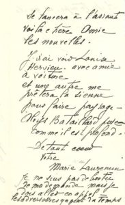Sur son procès pour récupérer l’appartement dont elle a été expulsée. [Expulsée en 1944 de son appartement jugé trop vaste pour deux personnes, elle trouva refuge chez le comte Étienne de Beaumont jusqu’à ce qu’en mars 1955, au terme d’une interminable procédure, elle gagne son procès et puisse enfin rentrer chez elle pour y mourir l’année suivante.] « Le président Legendre a été du côté des adversaires – malgré l’échange fictif de Mme Moins la locataire à laquelle j’ai loué en 1945. De plus il nie l’expulsion du comte de Beaumont qui est dans ses droits puisque je suis abritée depuis 1944. Je crois qu’à la rentrée Frédéric-Dupont se lancera à l’assaut. […] J’irai voir Louise Hervieu avec amie à voiture et une autre me prêtera la sienne pour faire paysage […] Je ne suis pas déboutée de ma demande mais je dois aller en appel – les adversaires gagnent du temps et du temps, ce qu’ils veulent »…