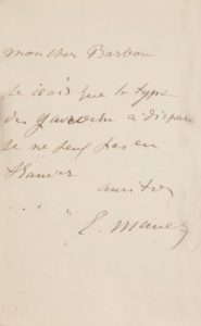 Édouard MANET (1832-1883). L.A.S., à son cher Barbou ; demi-page in-8 (encadrée). « Je crois …