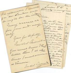 Michel Monet séjourne à Londres depuis le printemps 1899 et donne de ses nouvelles à sa belle-mère. Il se plaint souvent du temps affreux et s’enquiert de celui de Giverny ; il remercie des lettres envoyées par ses demi-sœurs Germaine et Blanche Hoschedé ; il doit retrouver son demi-frère Jean-Pierre à Boulogne. Il rend visite à Sargent et évoque la famille Darley, dont Sargent a fait le portrait. Il cherche un hôtel pour ses parents à Folkestone : « il n’y en a qu’un qui pourrait faire votre affaire, celui près de la mer où nous avons déjeuné l’an passé » ; il se réjouit de leur venue en septembre, avant son départ pour l’Amérique.