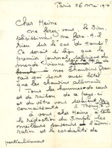 Théophile Alexandre STEINLEN. L.A. (brouillon), Paris 26 mai 1914, à Thomas Theodor Heine, fondateur de la revue satirique allemande Simplicissimus ; 1 page in-4.