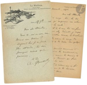 Paris 27 novembre 1894. Il réclame ses dessins : « aujourd’hui je ne peux plus attendre, tu sais pourquoi mieux que personne ». Château de Courtenay 21 novembre 1896. Sur son recueil de chansons et monologues Sur la route que doit illustrer Steinlen ; il lui envoie « les 40 pièces qui composeront mon volume », la musique des Canuts et des Nases suivra : « On pourrait et commencer à imprimer dès maintenant ; au fur et à mesure tu donnerais les dessins à Pairault qui ferait clicher lui-même. Je te solderai aussi au fur et à mesure de tes livraisons »… 4 septembre 1897. Il lui envoie un chèque pour solder leurs comptes.