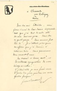 Paris 6 janvier 1895 : « vous n’êtes plus un misérable, mais un bon camarade. […] J’irai vous voir après l’apparition de Poil de Carotte et vous féliciter, si vous le méritez »… – Chaumot [1886 ?]. Il le remercie de l’envoi « du beau dessin impressionnant que j’ai tout de suite collé au mur sous mes yeux. […] Je n’attends plus que les affiches que j’ai données à mettre sur toile. Nous penserons donc souvent à vous. […] Si j’étais riche je vous ferais venir à prix d’or pour peindre nos murs. Quelles fresques ! »…