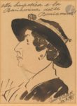 Portrait à la plume et au lavis d’une dame coiffée d’un chapeau, vue de profil, identifiée au verso comme Milka Ternina (cantatrice croate, 1863-1941), dédicacé « Alla Simpatica e la Beniamina delle Beniamine ! » Caruso a signé en bas à droite : « Enrico Caruso B.A. [Buenos Aires] 1915 ».