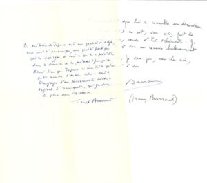 Ernest Ansermet (3, dont un jugement sur Duparc), Henry Barraud, François-Régis Bastide, Pierre Bergé (2), Jacques-Émile Blanche, Fernand Braudel (2), Martine Cadieu (3, et 4 livres avec envois), David Cairns, Jean-Louis Crémieux-Brilhac (belle réponse à son Schumann), Daniel-Lesur (2, dont jugement sur Duparc), André Delvaux, Suza et François Desnoyer (6), Henri Dutilleux (envoi de Mystère et mémoire des sons), Maurice Emmanuel, Raymond Gallois-Montbrun, Arthur Hoérée, Vladimir Jankélévitch, Betsy Jolas, Lili Kraus (programme dédicacé), Marcel Landowski, Jack Lang, Claude Lévi-Strauss, Antoine Livio, Hugh Macdonald, Edgar Morin, Pierre Nora (3), Charles Panzera, Jean-François Revel, Marthe Robert (2), Roland-Manuel (6), Paul Rouart, Gustave Samazeuilh, Henri Sauguet, Michel Schneider, Blanche Selva, Philippe Sollers, Pierre Vidal-Naquet, etc.