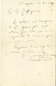 Giuseppe VERDI. L.A.S., Sant’Agata 12 novembre 1890, au cordonnier Giovanni Zaffignani à Piacenza ; ¾ page in-8, enveloppe ; en italien.