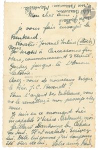 Il recopie un « admirable sonnet publié par un triste imbécile », le Dr Sylvain Eliascheff, dans sa thèse : Des écrits dans le délire d’interprétation. Ce sonnet, intitulé Résignation, dont Eluard souligne quelques passages, a été écrit par « Mlle L…. 1915 – après 27 ans d’internement et de “délire” (??). […] Pourquoi ne pas publier ce sonnet en tête de Chantiers et en en indiquant naturellement la source ? ». Il tâchera de procurer à Bousquet Les Malheurs des Immortels [de Max Ernst] et évoque les disques d’Adelina Fernandez, avant de conclure : « Mon très cher ami, je sais mal écrire, mal répondre par lettres à votre vivante amitié, mal me retrouver dans tout ce qui nous est commun »…