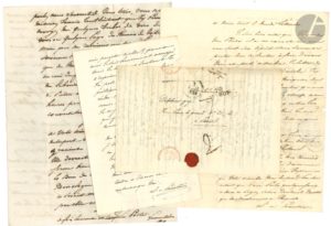 Saint-Point 31 décembre 1828, remerciant Mlle Delphine Gay de l’envoi de son volume de vers [Le Dernier Jour de Pompéi], où il a ressenti « un ton de mélancolie qui était moins senti dans les premiers volumes. Est-ce que vous seriez moins heureuse ? Quand on vous a connue c’est-à-dire aimée on a le droit de s’intéresser non seulement à l’ouvrage mais plus encore à l’écrivain. […] Pour moi je suis heureux et occuppé. Mais je n’écris et surtout je n’imprime rien. Je n’ose plus. J’ai passé la veine du bonheur poétique. J’en suis à la quiétude réelle. Cela vaut mieux. Je crains de la compromettre et je ne fais quelquefois des vers que pour me parler à moi-même »... Macon 2 juillet 1829, après un mois passé à la voir souvent, « et toujours avec une admiration et une sympathie croissantes non pas seulement pour votre beau génie poétique, mais pour vos mille qualités d’esprit et d’âme qui vous feraient aimer même par ceux qui ne sauraient ni lire ni entendre »… Château de Montculot 15 septembre 1829. Ses amis l’ont dissuadé d’envoyer les vers qu’il avait composés : « Ils ont prétendu qu’ils n’étaient pas assez compassés, mesurés, rognés, limés, pour être adressés à une jeune et belle personne comme vous ; qu’on mettrait sur le compte de sentiments personnels ce qui n’était que de l’admiration poétique ; que cela ferait un mauvais effet pour vous, un pire pour moi »... Il s’interroge sur sa « destinée diplomatique »… 15 janvier 1830, il est « dans des embarras de fortune et de position », et très triste. Il compose son discours de réception à l’Académie : « J’ai écrit ces quatre jours-ci l’éloge de M. Daru. C’est détestable, comme ce qu’on écrit de commande quand on a envie de pleurer plus que d’écrire »...