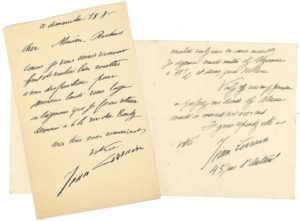 [Émile Rochard (1850-1918), auteur dramatique et directeur de théâtres, dirigea l’Ambigu-Comique sis à l’angle de la rue de Bondy et du boulevard Saint-Martin de 1884 à 1903.] Ce dimanche 18 X [1885 ou 1891 ?], il demande une loge qu’il fera retirer rue de Bondy. – [1898]. « J’ai lu, j’ai appris avec quelle joie votre nomination de directeur du Châtelet. Avez-vous lu la Mandragore. Cette fois vous ne pouvez pas me dire que le cadre n’y est pas, je voudrais vous causer le plus tôt possible de cela, j’introduirai dans le drame deux ou trois tableaux de mise en scène qui seraient des choses épatantes, comme on en a jamais encore vu ici »…