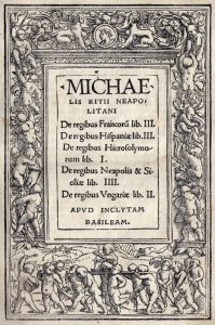 RICCIO (Michele). De regibus Francoru[m] lib. III. De regibus Hispaniæ lib. III. De regibus Hierosolymorum lib. I. De regibus Neapolis & Siciliæ lib. IIII. De regibus Ungariæ lib. II. Bâle, Johann Froben, 1517. Petit in-4, chamois ocre, dos à...
