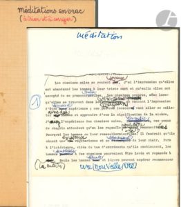 On joint 2 feuillets autographes (4 p.), liste de noms à l’encre noire biffés ou encadrés en rouge (Eva d’Oncques, Zéphirine Barbot, etc.) ; et la photocopie d’un autre tapuscrit corrigé de Méditations en vrac (78 p.).