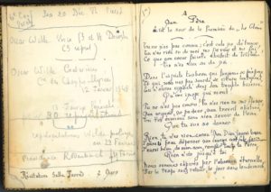 Précieux carnet renfermant de nombreux poèmes, en brouillons ou mises au net corrigées, avec textes en prose, minutes de lettres, notes diverses, comptes, engagements, noms et adresses, à l’encre ou au crayon.
