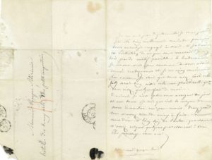 Une des trois lettres connues de George Sand à Mérimée, lors de leur brève liaison [le cachet postal de cette lettre a permis de redater à la fin mars 1833 cette liaison qui s’acheva par un fameux fiasco].