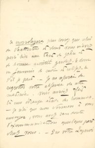 « Ce monologue plus long que celui de Chatterton et dont vous m’avez parlé hier soir avec tant de grâce et de bonne amitié gardez-le donc en souvenir de moi et relisez-le s’il se peut. – Je ne cesserai de regretter votre absence de cette matinée. Vous auriez fait là une étrange étude des hommes. – Je n’ai que mon sermon à vous envoyer, vous avez sans doute l’excommunication quelque part chez vous. – Que votre Loyauté était charmante hier dans sa révolte pour moi ! Je vous en remercie du fond de ce cœur qui n’oublia jamais un sourire : – et n’accorda jamais le pardon d’une offense » [Vigny cite ici un vers du poème Magdeleine (1822) de la jeune Delphine Gay]…
