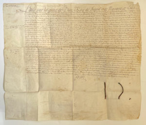 Lettres de rémission à la suite d'un incident de chasse. Géraud Peitevin, habitant de Boujan près de Béziers, brigadier d'une compagnie de cavalerie dans le régiment de la Reine, a commis un homicide sur la personne d'un homme qui cherchait à tort à l'empêcher de chasser sur des terres de Boujan. La famille du défunt et les juges du lieu ayant considéré qu'il s'agissait d'un cas involontaire de légitime défense, le roi lui octroie sa grâce pour lui éviter toute poursuite dont il pourrait faire l'objet. Intéressant document relatant en détail la partie de chasse et l'incident.